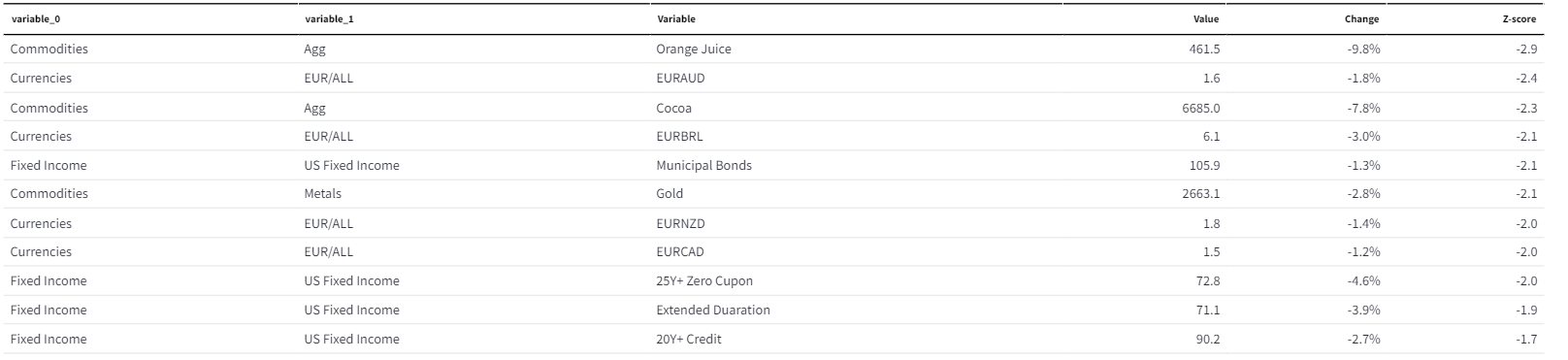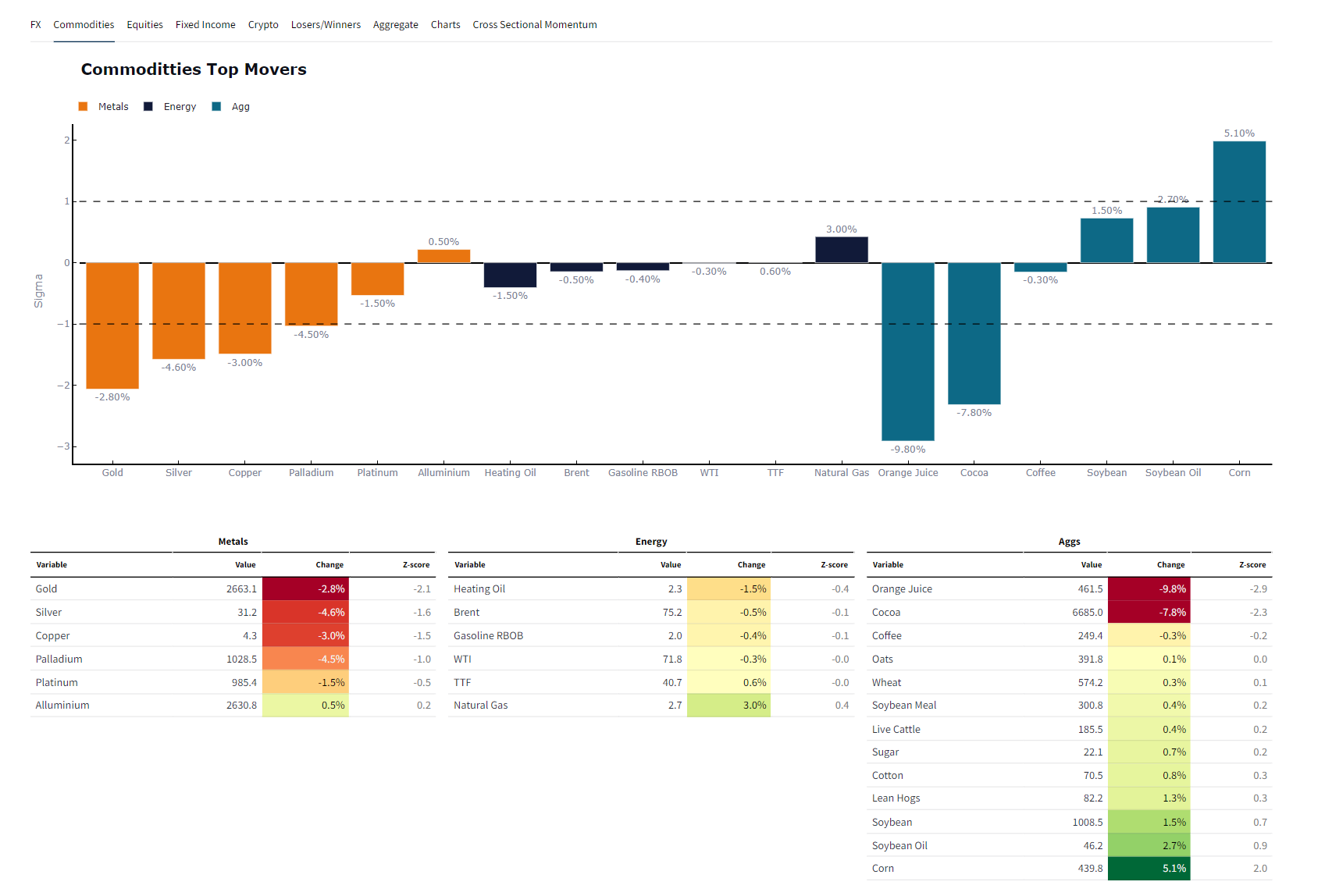 To achieve a consistent comparison across assets, we utilize Z-scores, which enable us to standardize movements for an apples-to-apples comparison rather than apples-to-oranges. Ultimately, this helps us identify where supply and demand for an asset have triggered unusual activity.