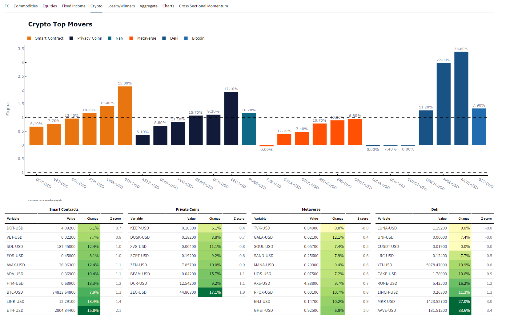 We'll examine cross-asset movements in ETFs, commodity futures, and cryptocurrencies over various timeframes, aiming to visualize the most significant deviations based on the average volatility of the past five years.