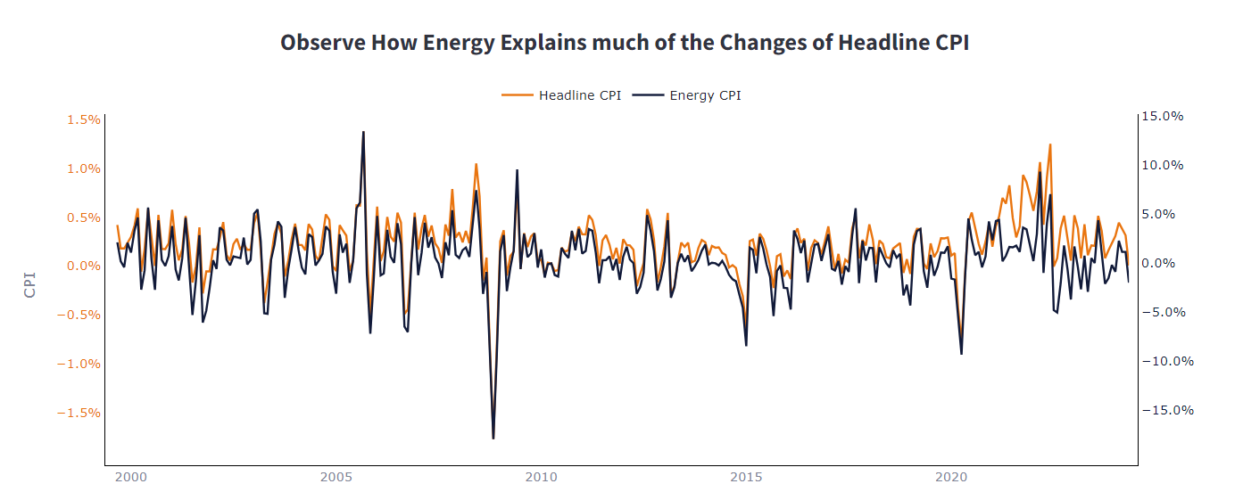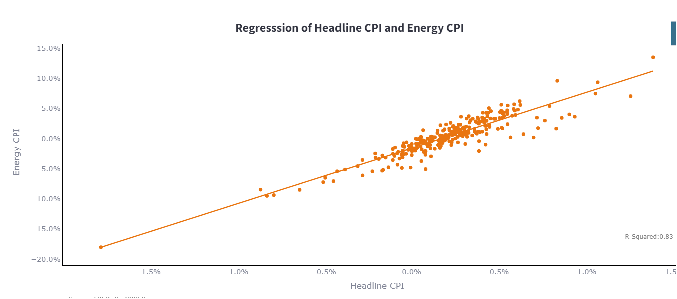 Running a Basic Regression over the past 25 Years of data or monthly changes in CPI, we can say that Energy Alone Can Explain Around 83% of the changes in CPI, meaning that other more stable components explain only 17%, but they are a significant part of the consumer's daily basket.
