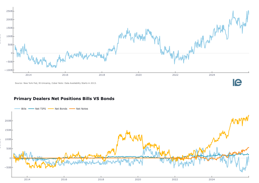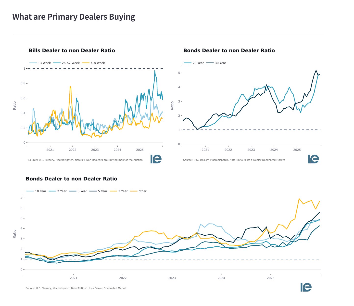 These are elevated levels. Dealers are required to bid as primary dealers, but these ratios tell you they're absorbing larger shares of issuance while other buyers step back.