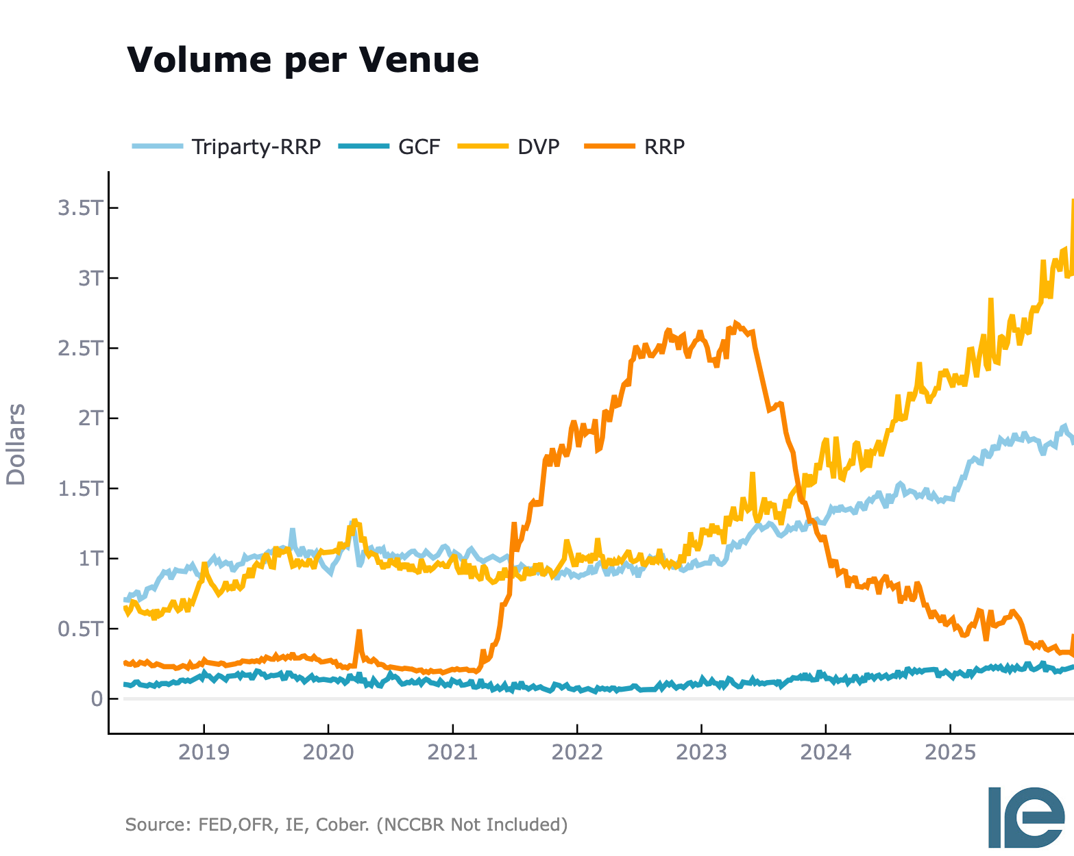 - Volumes across different repo venues, especially DVP, show how market structure is adapting, and the drain of sponsored shows some deleveraging.