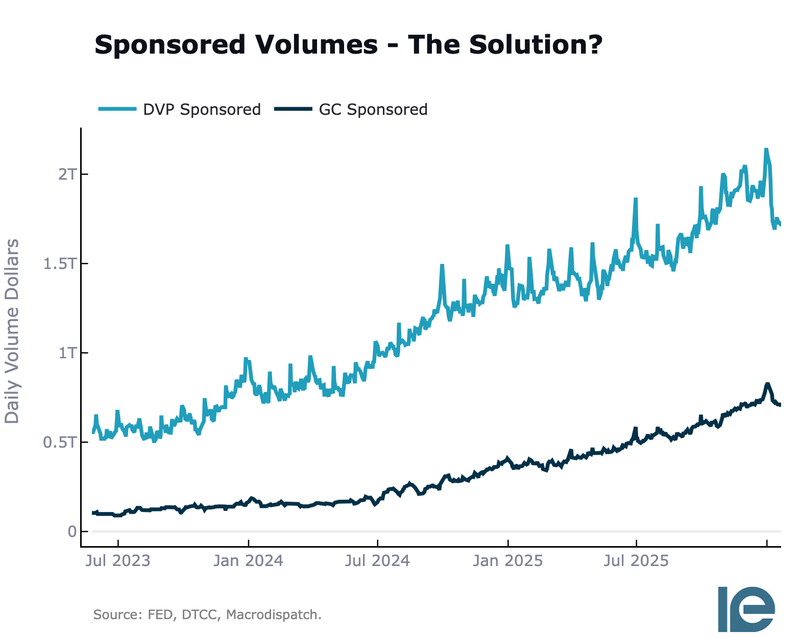 Sponsored repo, where dealers bring clients into centrally cleared markets, accounts for over two trillion dollars of this. The remaining $1.5 trillion is non-sponsored DVP activity.